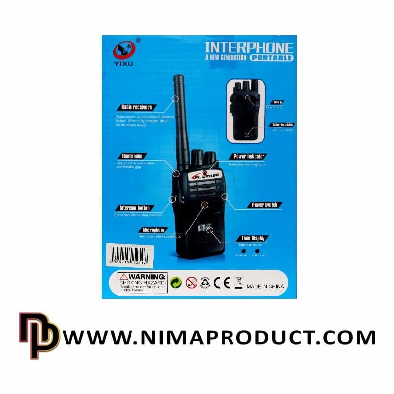سایر توضیحات: داراي گيره نصب لباس – داراي دكمه اينتركام – چراغ خاموش روشن – دكمه خاموش روشن – ميكروفون – ساخته شده از پلاستيك با كيفيت – صفحهنمايش ساعت – بيخطر براي بازي كودكان – كيفيت صداي بالا